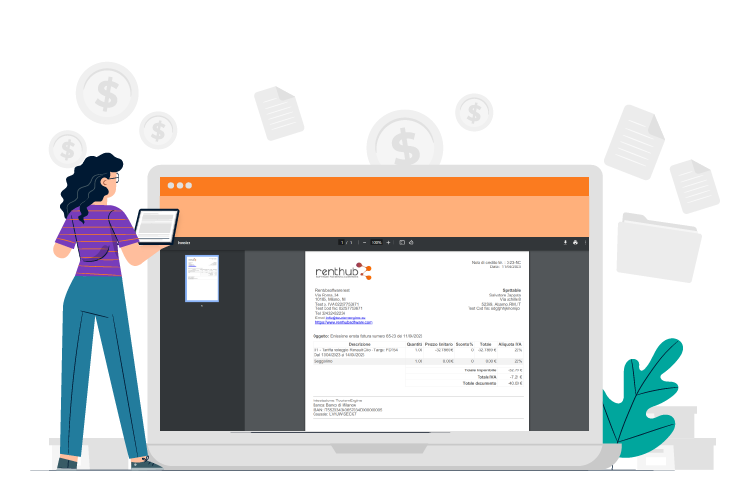 Invoice, as in the fiscal document the system generates in the legally required format. Combined with automatic email delivery to your customer at the end of the rental.